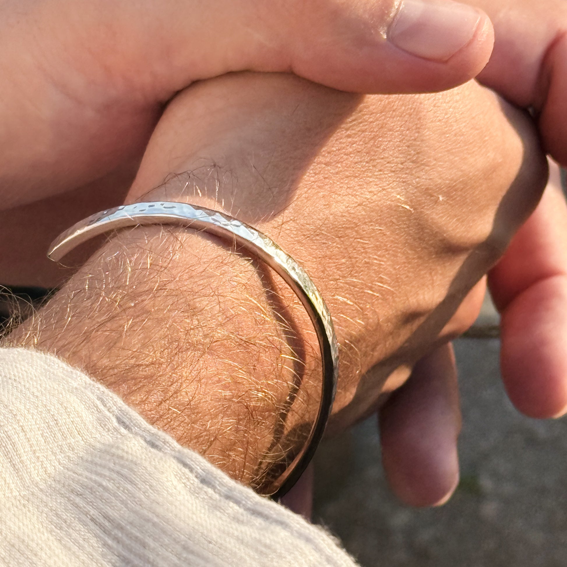 Crafted from high-quality 925 sterling silver, the Incus Cuff Bracelet features a hammered texture that adds a sophisticated, artisanal touch. Its open cuff design allows for easy adjustment to fit most wrist sizes comfortably. This one-size accessory combines durability with elegant simplicity, making it a versatile piece for both casual and formal wear.